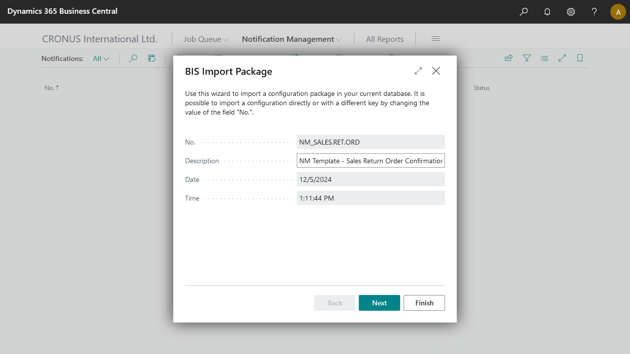 - Import NM_SALES.RET.ORD.zip configuration package or use the BIS template if available.