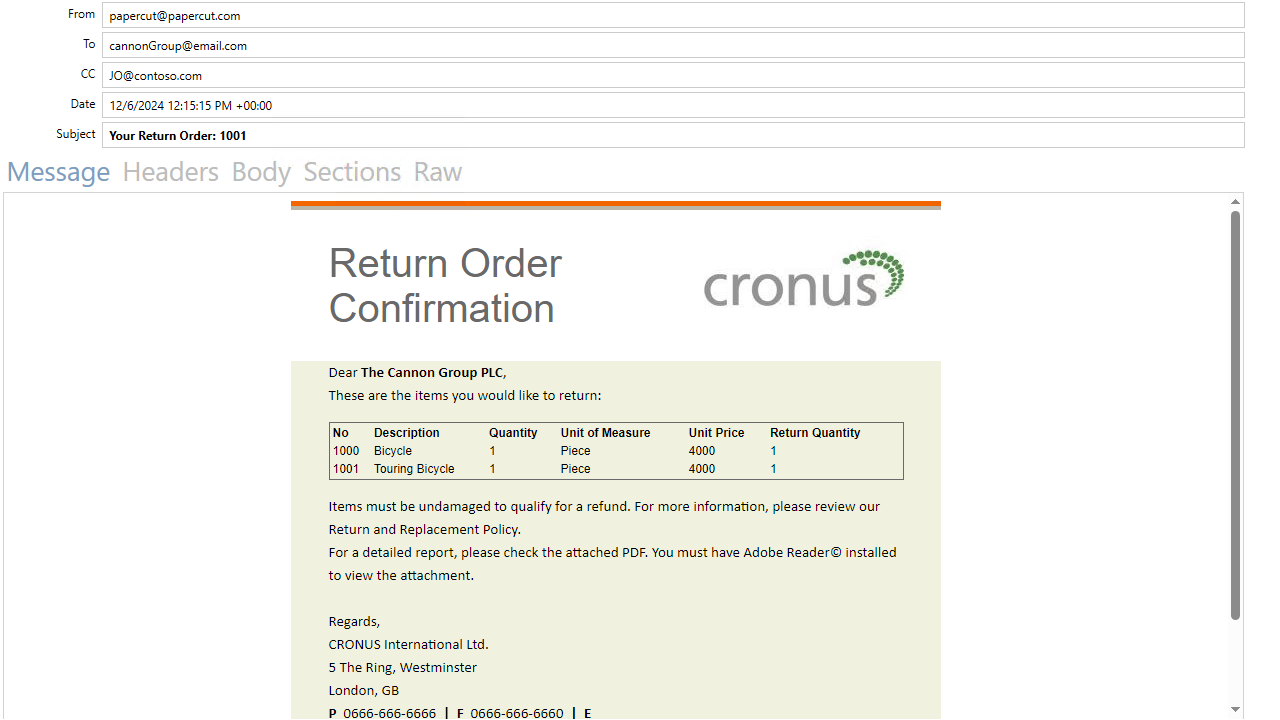 The result is that the mail is sent to all receipients. By using papercut, instead of sending it to receipients, we've captured the mail on our demo environment, with a preview of the HTML mail body and a PDF attachment of the Return Order Confirmation report.